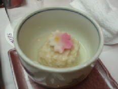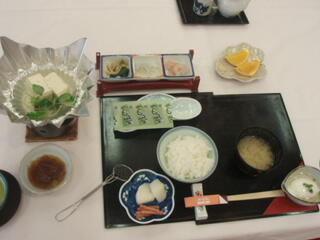 今日の料理は、桜の花びらが乗った胡麻豆腐、ほたるいかのねぎぬた、さしみ3種、前菜6種、つみれ鍋、筍と湯葉の煮物、つみれのようなジューシーな饅頭、岩魚の味噌焼き辛子レンコン添え、ご飯に赤味噌のなめこ汁、カニ、野菜の揚げ物、デザートです。