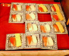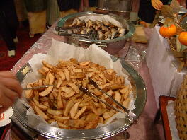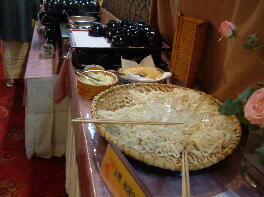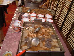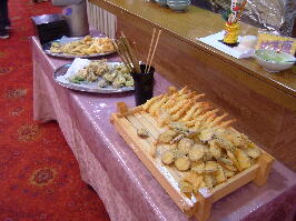 後の料理は、五種類のオードブル、豚ロースの炒め物、しゅうまい、白身魚のトマトソース和え、すき焼き、おでん、まぐろのさしみ、すし、お雑煮、サラダ、天麩羅、水沢うどんなど40種類位あったかな。