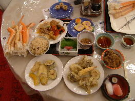 キタ-!!って感じでした。とにかくこの写真をみてください。どれもおいしくてお腹いっぱいになりました。ズワイ蟹一杯とさしみ類、数の子に鍋、茶碗蒸しにそば、ご飯は、散らし寿司でした。とても幸せです。