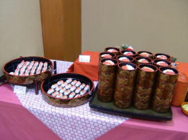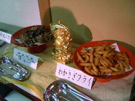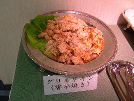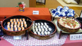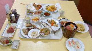 後は、まぐろ、えび、あなご、甘えび、ずわい蟹のすしに、豚の角煮、大根の煮つけ、やきそば、おそば、ほたてのグラタン、鶏の香草焼き、あげもの4種、五目飯、オムライス、ポテトフライ、白身魚の梅のせ、わかさぎのフライ、えびチリ、やきとり、牛肉の煮込みなどがありました。サラダ、果物のコ−ナ−は別になってました。