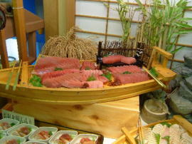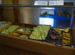 ここのバイキングは、魚介中心になっていて、いか、甘えび、さわら、マグロのさしみ、金目鯛の茶碗蒸、金目鯛のあら汁、あじの塩焼き、えびのてんぷらなどがありました。あじの開いてないのは初めて見たかも。
