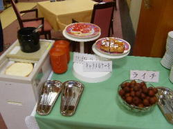 果物は、メロン、パイナップル、ライチがあり、スウィ−ツは、ケ−キが2種とバニラアイスがありました。カプチ−ノケ−キがおいしかったです。中にピ−ナッツが入ってました。