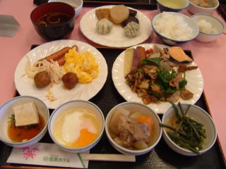 一転、朝のバイキングは、白水館ほどではないけど、まあまあ品数も多く満足でした。豚肉とピーマンの炒め物、トンコツの煮物が特においしかったです。