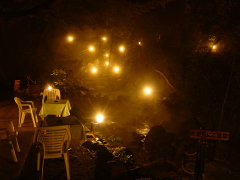そして、場所に着いたんだけど、暗くて湯槽がみえない。ライトはいっぱいあるのですが、目が慣れるまでは、かなり恐かったです。足は滑るし、浴衣にしみ込んだお湯がさめて冷たいし、浴衣がまとわりついて、歩きづらいし最悪でした。
