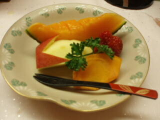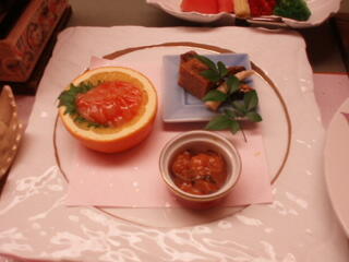 今日の、びっくり料理は、オレンジの果肉の皿に、イカともみじを和えたものが乗ってたんです。とても不思議な味でした。
