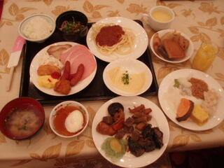 料理は、チャーシユー、ハム、ウィンナー、スクランブルエッグ、焼売、玉子焼き、温泉玉子、茄子の煮物、おでん、筑前煮、鮭、いかソーメン、ミートスパゲティ、そば、あさり味噌汁、コーンポタージュ、自家製豆腐、その他漬物類、パン類、くだもの3種、フルーツポンチ、アンニン豆腐などです。