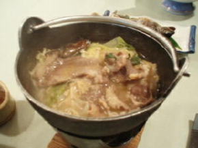 料理は、猪鍋、前菜6種、酢の物、お造り、岩魚塩焼き、炊き合わせ、茶碗蒸し、てんぷら4種、味噌汁、アイスクリームです。