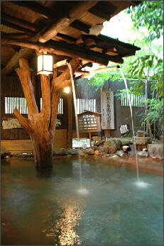 フロントで案内を受けて、さっそく露天風呂へ。いろんな形の岩を配した露天風呂は、打たせ湯が横にあり、周りの木々と共に、目を楽しませてくれます。
