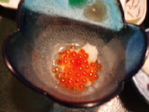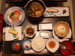 朝の料理は、いくらと大根、卵焼き、サラダ、ハムのオードブル、鮭の塩焼き、ざる豆腐、みそ汁、のり、ご飯三合です。