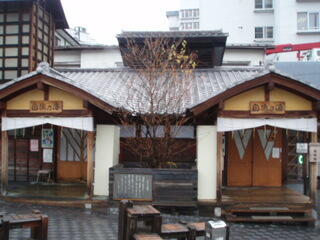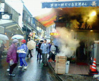 少し歩くと、温泉饅頭とお茶を、無料で配ってる、饅頭屋さんがあります。