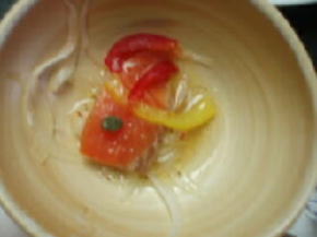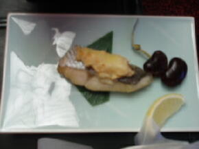 今日の料理は、食前酒に、清酒仕込み梅酒、サーモンマリネ、前菜三種、湯葉鍋、お造り3種、煮物、茶碗蒸し、牛ワインソース煮、スズキぴり辛焼き、大和磯辺揚げ、舞茸揚げ、野菜椀、カットフルーツ、サボテンゼリーです。