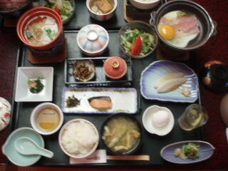 梅雑炊、鮭、ベーコンエッグ、笹かまぼこのわさび漬け、たこわさ、煮物、小皿2種、サラダ、味噌汁、ご飯です。
