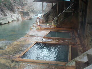 あの有名な川岸露天風呂の途中にあり、湯槽は、人が2人ゆったり入れる感じの広さです。お湯は、乳緑色のお湯で、熱かったので、水を入れながらぬるめました。