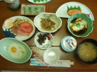 生ハムのサラダ、だしの入った温泉玉子、とろろ玉子、鮭の切り身、味噌汁、煮物、ヨーグルトなどです。