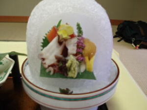 牛肉の陶板焼き、氷のかまくらに入ったさしみ、オードブル5種類、天ぷら、ホワイトシチューのパイ包み焼き、あゆの塩焼き、ふかひれの茶碗蒸しなどです。