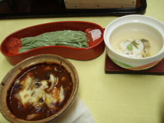 後で来た料理の写真です。抹茶うどん、ビーフシチュー、鯛のかぶら蒸しなんですけど、そのうち、抹茶うどんとビーフシチューは、うちの奥さんが食べれないと言って、もらいました。ラッキー!ご飯も、さすがに昨日、秒殺だったので、多めに持ってきてました。