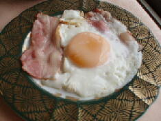 目の前で作る、ベーコンエッグもおいしいですよ。さらに、朝、つきたてのお餅を、ぜんざいとお雑煮で食べれるんです。正月でもないのに、お雑煮が食べれて感動です。