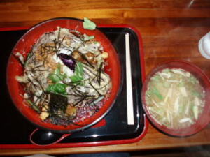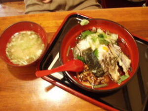 僕は、なっとうの方を注文。もちろん大盛りです。どうですか!この山菜の盛り!素晴らしくて感動ものです。中にカリカリの、舞茸、ナス、あなごのてんぷらが、入っててかなりおいしかったです。