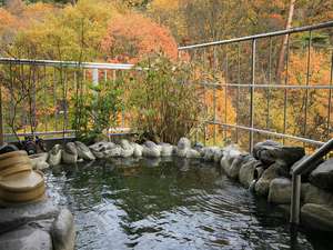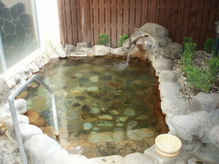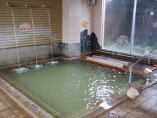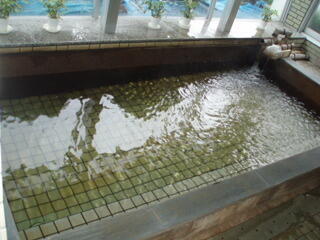 循環の大きい浴槽の方は、緑がかってて、白も混ざってる感じのお湯で、少しヌルヌルしました。その外に、半露天の岩風呂もあり、ずっと入ってました。ここは透明で、茶色の湯の華が浮いてました。