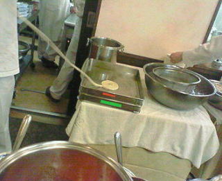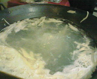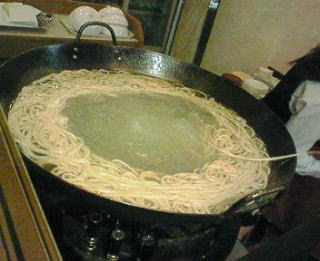 一本の、切れ目のない麺を、少しづつお湯に入れて茹でます。