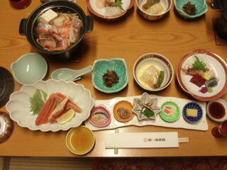 前菜5種、北海鍋、お造り4種、知床鶏と大根の煮物、白身魚のスフレ アメリカソース、ずわい蟹、茶碗蒸し、なめこ汁、ごはんいっぱい、デザートに豆乳アイスです。