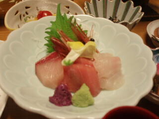 次は、お造りです。4種なんですけど、昨日よりひそかに、グレードアップしてました。ボタン海老が二匹になっていて、普通の赤みが中トロになってたんです。ぶりと白身魚もありました。