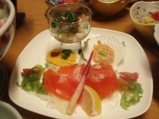 スモークサーモンとホタテの冷製、お造り4種、豚肉のしゃぶしゃぶ胡麻だれ、ほたてとえびのグラタン、白身魚の甘酢あんかけ、蒸し鶏絹田巻き、ホタテ磯辺揚げ、ごはんいっぱい、味噌汁、デザートです。