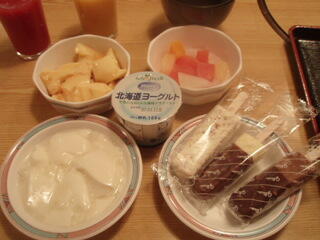 後、伊達巻き、ししゃも、お雑煮、ボルシチ、鮭、紅白かまぼこ、赤飯、肉じゃが、ウィンナー、スクランブルエッグ、野菜類、くだもの、デザートアイスクリ−ムなど、なかなか充実してました。