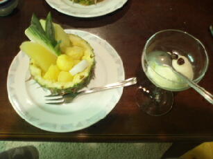 デザートが、さらにびっくり。パインの皿に、メロン、洋梨、パインが入ってました。さらに、小岩井アイスが出てきました!やっぱりうまいですねー。
