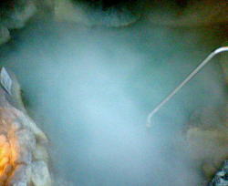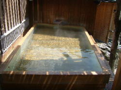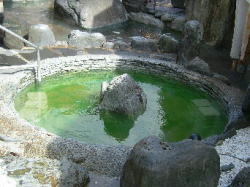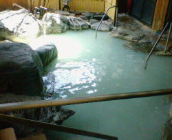 山荘に着くと、さっそく源泉露天風呂へ。ここの泉質は、ナトリウムマグネシウム炭酸水素硫酸塩塩化物泉です。マグネシューム泉と言われてますが、なかなかいい温泉でした。お湯は、白くなりかけた緑のお湯で、マグネシューム泉特有の匂いがします。なめらかなお湯です。