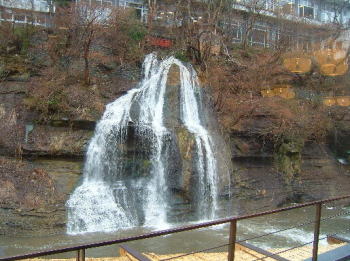 泉質は、ナトリウムカルシウム塩化物炭酸水素塩泉です。緑色のお湯でした。湯仙峡の一階に広い休憩所があり、ここから滝が見えます。すごい展望なので、部屋に帰らずここで休みました。