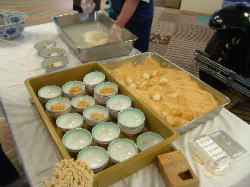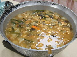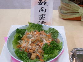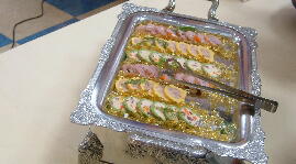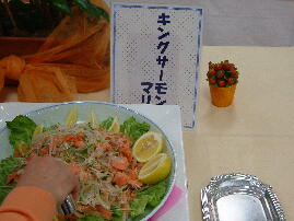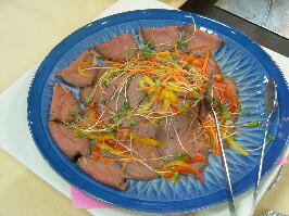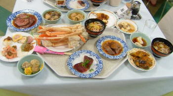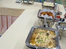 今回の料理は、ずわい蟹、ロ−ストビ−フ、ステ−キ、味噌カツ、水餃子、ふかひれス−プ、さしみこんにゃく、湯葉さしみ、鰹のタタキ、すき焼き、鍋物、ナスのトマトソ−ス、そば、うどん、飲茶5種、五目ずし、巻きすし、マテン麺、から揚げ、キングサ−モン、社家南蛮漬けなどです。