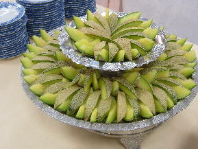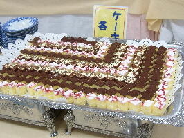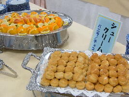 デザ−トは、シュ−クリ−ム二種、ケ−キ4種に果物が、オレンジ、グレ−プフル−ツ、メロンなどです。その中で、シュ−クリ−ムがかなりうまくて、10個食べてしまいました。生クリ−ムとカスタ−ドがいい具合に混ざってておいしかったです。
