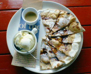 デザートピザなんですけど、ピザ生地にエスプレッソソースをかけて、アイスを乗っけてたべるのです。アツアツサクサクピザ生地に、アイスを乗せた時、溶けて柔らかくなった所を、パクッと食べます。エスプレッソコーヒー付きです。