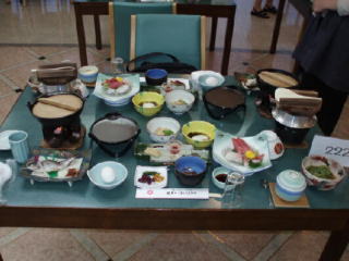他に、すき焼き鍋、さしみ、岩魚の塩焼き、茶碗蒸し、そば、天ぷら、煮物二種、味噌汁、デザートがありました。