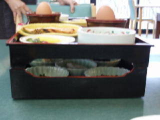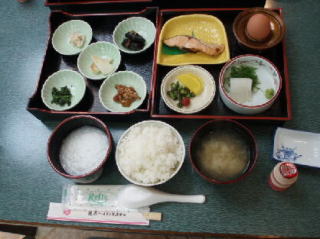 朝食は、席に着くと、二段になったお膳があり、びっくりしました。鮭、温泉玉子、ご飯に合うお惣菜がありました。一つ一つの量が少なめだったけど、なんとかご飯3杯食べれました。
