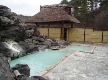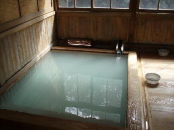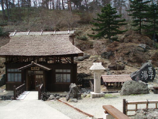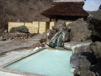 ここの特徴は、明治元年から、ずっと使われている茅葺屋根の湯小屋と、いろんな雑誌に登場している露天風呂、薬湯といわれる効能豊かな、乳青色の温泉です。