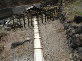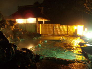 周りは、溶岩が固まった石を使い、湯槽はぬる湯と熱湯の二つがあります。