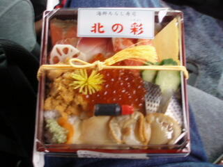 今回のツア−特典で、この駅弁が無料になりました。3番目の写真の駅弁5種から選べます。さらに、お茶も付いてきました。