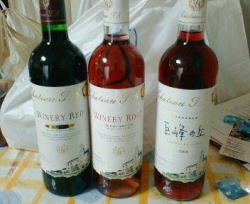 うちの奥さんは、真ん中のやや甘口のロゼで、僕は、右の巨峰の丘という甘口のロゼを買いました。特に巨峰の丘は、12番目に試飲したのですが、甘くてフルーティーで、飲みやすく、かなり気に入ってしまいました。一番左のワインは、僕のもう一本お気に入りの赤ワインです。(無料でもらったワイン)