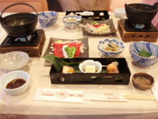 食事は、うれしい誤算でした!実は、席に案内されたら、和会席の料理がありました。お茶の牛しゃぶを始め、前菜、さしみ、酒の肴など、いろいろありました。
