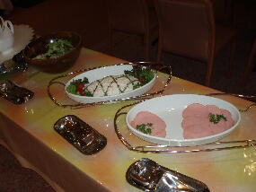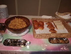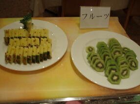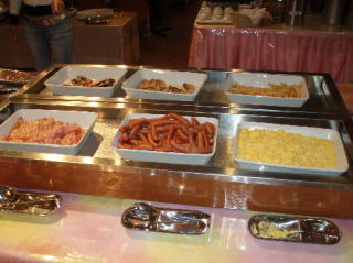 朝食は、いつもの定番メニュ−でした。温泉玉子、鯖、鮭の塩焼き、玉子焼き、スクランブルエッグ、煮物、シュウマイ、ベ−コン、ハム、ウィンナ−、サラダ、ごはん、パン、オ−トミ−ル、お味噌汁、お粥、漬物類、牛乳、ジュ−ス類、コ−ヒ−、果物、デザ−トって感じです。